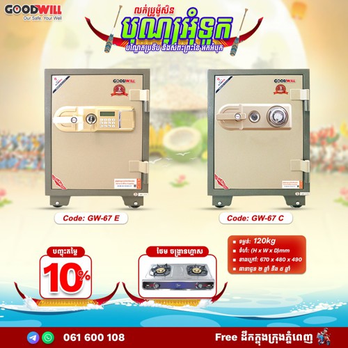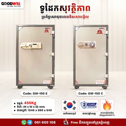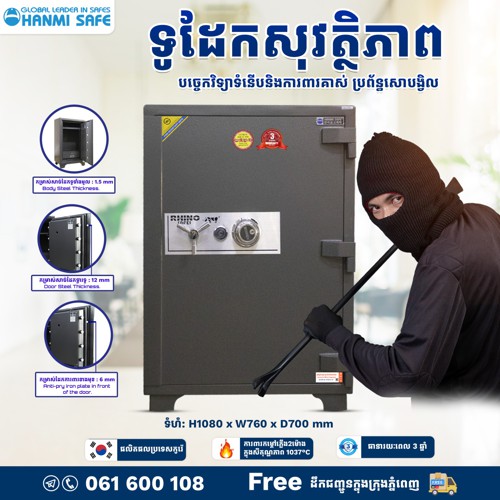 ទូដែក សុវត្ថិភាព -លេខកូដ : GW-37 C - ទម្ងន់ 45Kg - ទំហំ : (H x W x D) mm - ខាងក្រៅ៖ 330 x 420 x 370 - ខាងក្នុង : 181 x 301 x 230 - ផលិតផលប្រទេសកូរ៉េ ការការពារភ្លើងបាន 1037 ត្រាំ 2 ម៉ោង។ -ធានា រយៈពេល ៥ ឆ្នាំ។ ទូរស័ព្ទ៖ 076 66 00 107